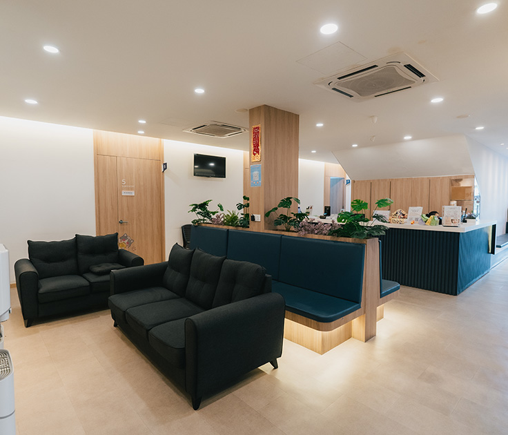 Our Skudai clinic features a spacious and welcoming waiting area designed to help patients feel relaxed before their appointment. With comfortable seating, warm lighting, and a calm interior design, the space creates a pleasant environment for both individuals and families.